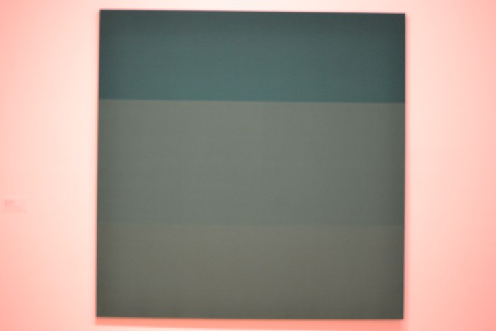 Untitled by Blinky Palermo, 1970. Dyed cotton mounted on muslin. Simplicity at its best, from the title to the 2-shade green. Minimalism & geometric.