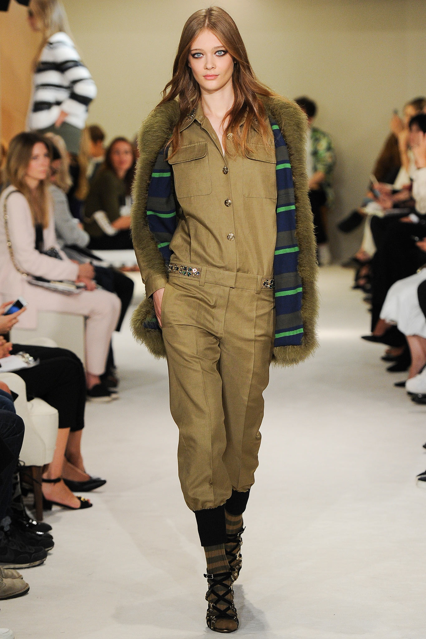 Military fashions were front and center on Spring 2015 Ready-to-Wear runways. Fatigue pants, cargo pockets, slightly oversized shapes, and uniforms on the Marc Jacobs runway. Chanel and Sonia Rykiel also sent models down the ruways sporting nautical looks, navy stripes, and shades of green, and tailored pants on models down the runways.